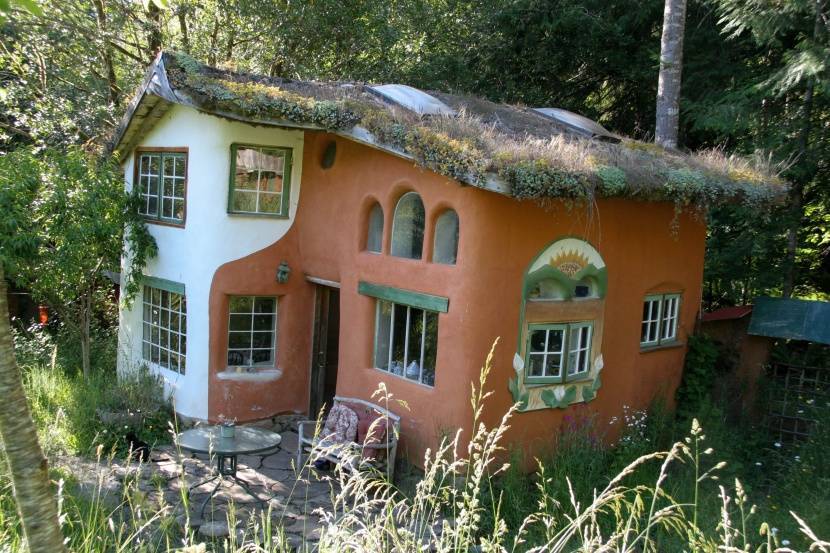 Не составит никаких хлопот возвести здание в форме круга, в этом случае не возникает трудностей с установкой углов и проемов. Фасад такой глиночурки только выиграет в плане оригинальности. Поленную кладку можно также включать как декоративный элемент, а не только как основную стену.