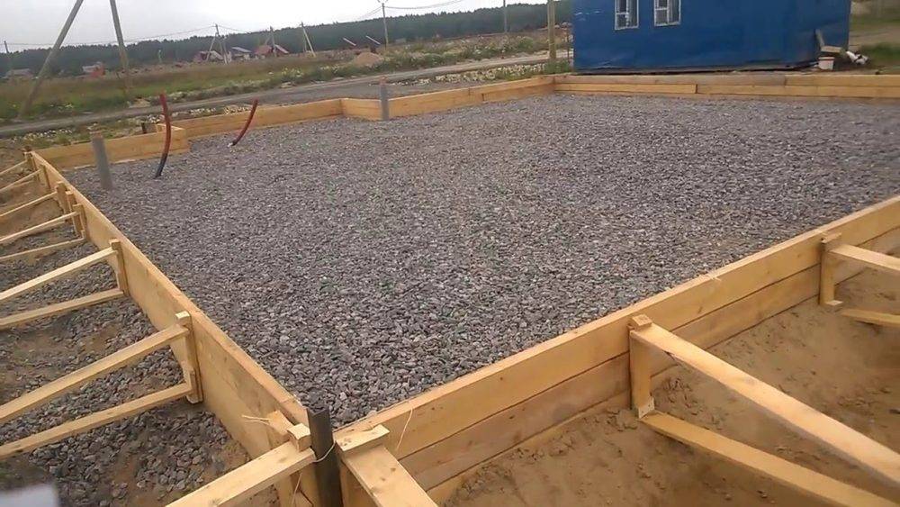 Чаще всего глубина заложения составляет 35-42 см ниже нулевой отметки. Предварительные работы по созданию котлована предусматривают удаление верхнего пласта почвы до несущего уровня. После этого делается углубление на высоту отсыпной подушки. Периметр заливается сцепляющим составом (минимальная высота составляет 20 см над поверхностью грунта).