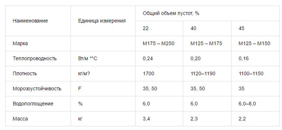 | Геометрические размеры: 250x120x65 ммМасса (справочно): 2,5–2,6 кгПустотность: 33%Прочность на сжатие: 50 кгс/см² (М-150)Теплопроводность кладки: 0,44 Вт/м°CВодопоглощение: 10–12%Морозостойкость: свыше 35 циклов |