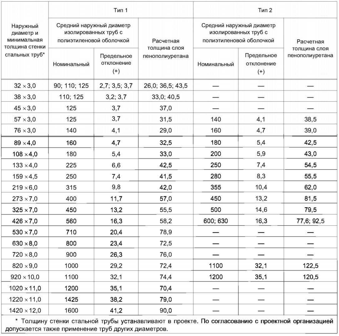 Минимальный диаметр труб под ППУ теплоизолятор у большинства поставщиков составляет 25 мм при максимальном не более 1420 мм, типоразмеры толщины стенки — 40, 50, 60, 70, 80 и 100 мм.