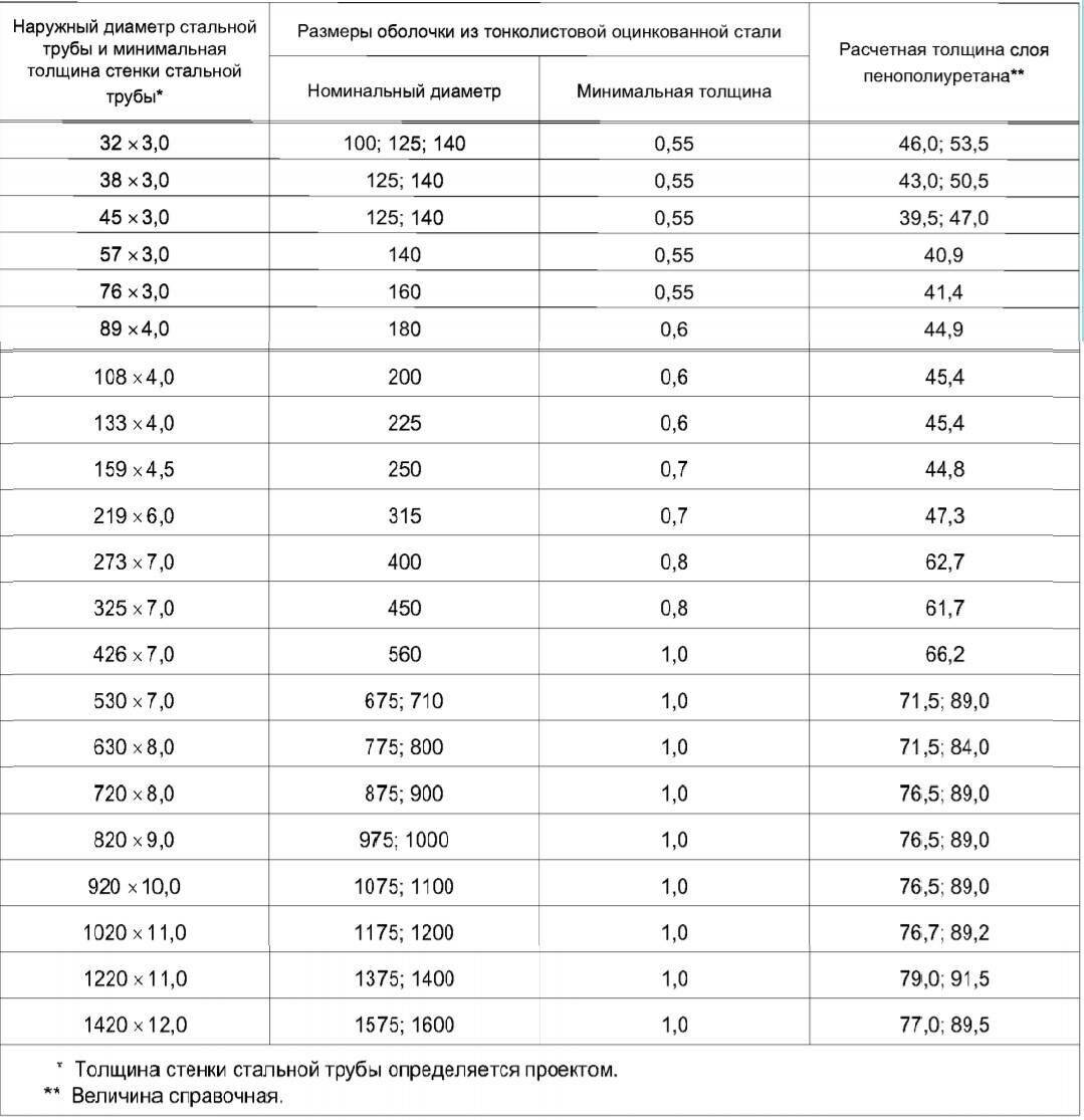 - ППУ утеплитель для труб скорлупа выпускают для трубопроводов диаметром от 57 до 1420 мм. Типоразмеры скорлуп соответствуют приведенным в ГОСТ 30732-2006 на трубы и фасонные элементы с теплоизоляцией из ППУ в тонколистовой стальной или полиэтиленовой ПЭ защитной оболочке (таблица на рис. 2).