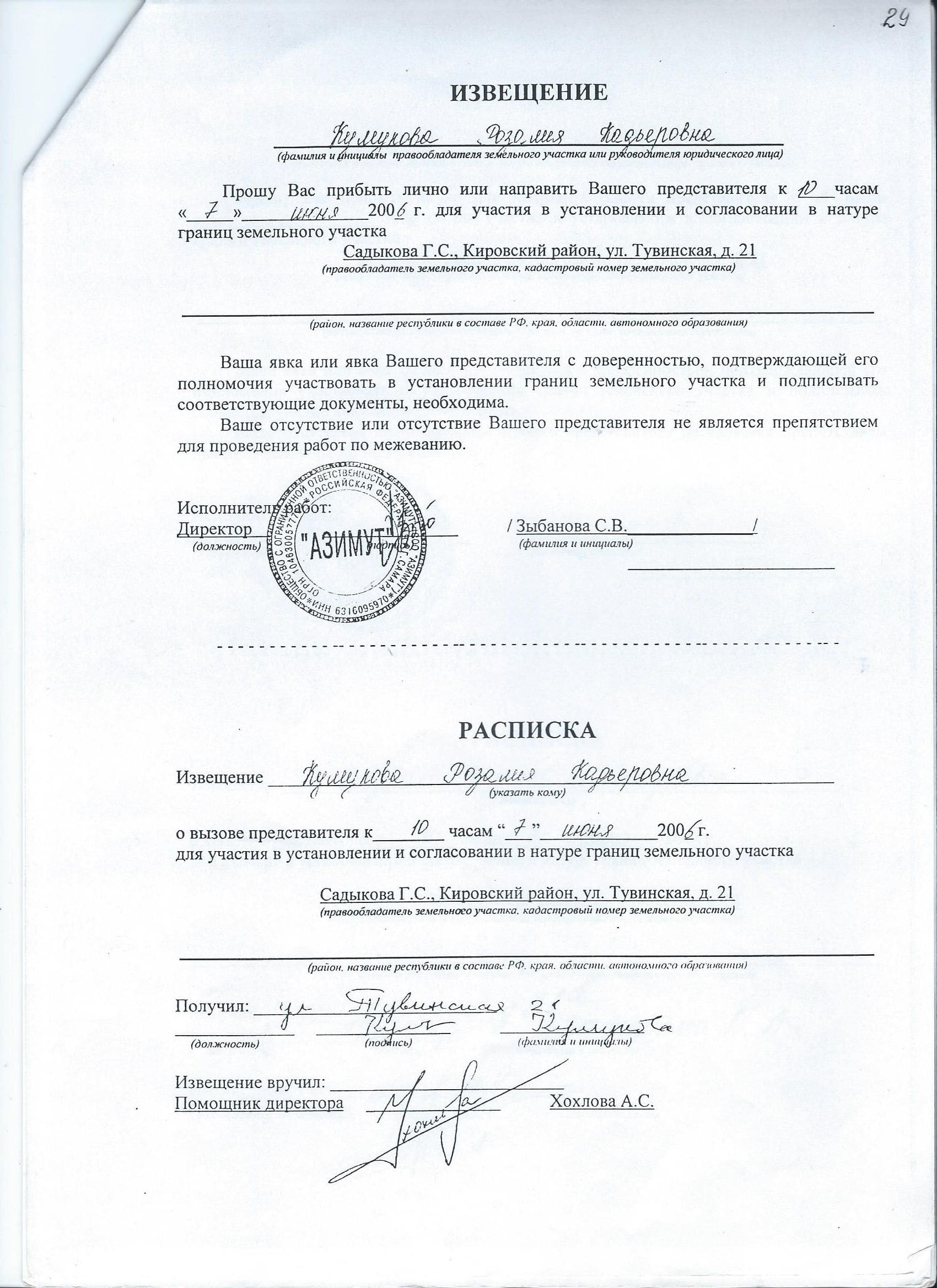 Заказным письмом удобно известить граждан, чье местонахождение известно, но которые настроены недоброжелательно к планируемой процедуре. Если они будут уведомлены троекратно и проигнорируют извещения, не явившись, то к акту вместо подписи подшиваются документы о почтовом отправлении, полученные у оператора почтового отделения, и удостоверенные его подписью и печатью.