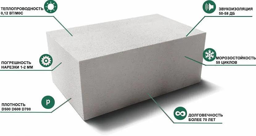 Блоки имеют практически идеальные формы, а отклонения в размерах составляют всего от 0,3 до 0,8 мм. Материал долговечен и морозостоек, способен выдержать до 100 циклов.