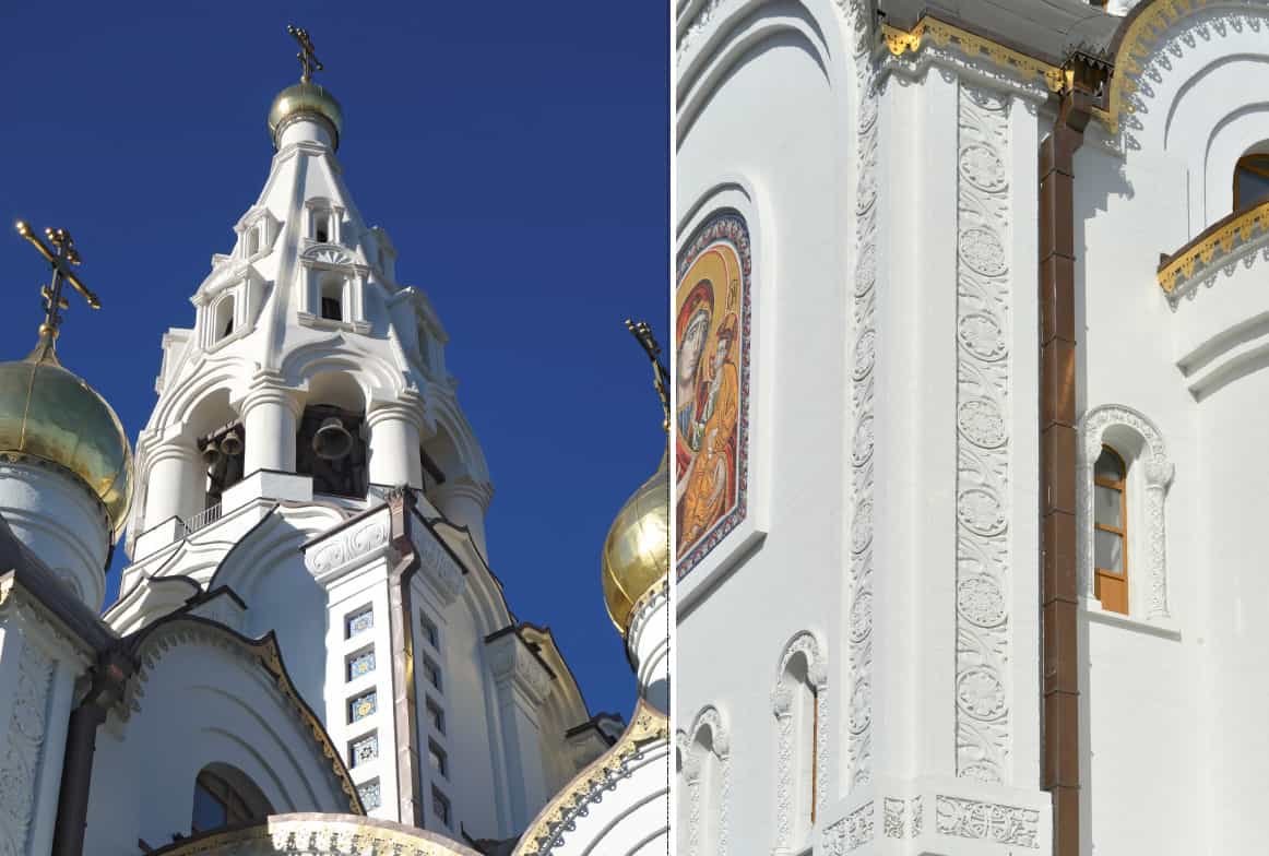 Как ни удивительно, инновационный материал применен специалистами концерна «КРОСТ» в архитектуре, которая строго подчинена канонам — в храмах. Прочный и не подверженный выцветанию, желтению и разрушению, армированный стекловолокном бетон начали использовать вместо известняка для различных декоративных элементов — капителей, обрамлений окон, порталов и прясел и других узорчатых деталей. Его пластичность позволяла выполнить рельефы с высокой детализацией, а покрытие лессирующими красками сделало почти неотличимым от натурального камня. Но, в отличие от него, фибробетон остается белоснежным на многие десятилетия — в этом заключается его неоспоримое преимущество.