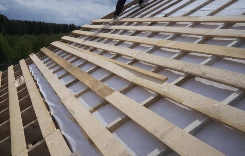 Обрешетка будущей крыши укладывается на стропила. Как правило, для нее выбирают доски. А их толщина полностью зависит от типа кровельного материала. Нельзя применять доски с большим количеством сучков. Так как под сильной нагрузкой они могут сломаться. Необструганные доски укладываются выпуклой стороной вниз. В результате этого случайно просочившаяся влага сможет просто скатиться по ним.