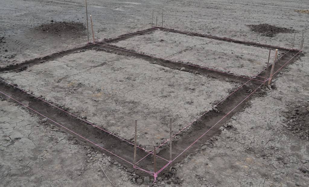 Перед возведением фундамента под дом из бревна, необходимо провести разметку участка. Для этого, по углам будущего дома вбиваются колышки, и между ними натягивается бечевка, обозначающая его контуры. Далее выкапывается траншея глубиной 60-70 см и шириной равной ширине фундамента, а она зависит от диаметра, выбранного для строительства бревна. Желательно, что бы снаружи фундамент выступал за стену на 5 см, а изнутри на 10 см. Внутренний выступ необходим для более устойчивого и качественного прилегания половых лаг.