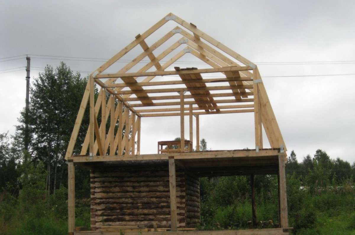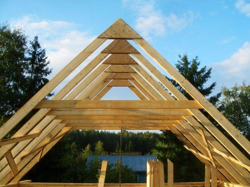 На перекрытии дома раскладываются доски 50×150 мм, изготавливается треугольник необходимой высоты из двух стропильных ног и доски-стойки (ее длина соответствует высоте будущей крыши), соединенных гвоздем. Вдвоем или втроем конструкция поднимается — стойка устанавливается на центральной оси перекрытия, стропила устанавливаются на мауэрлат.