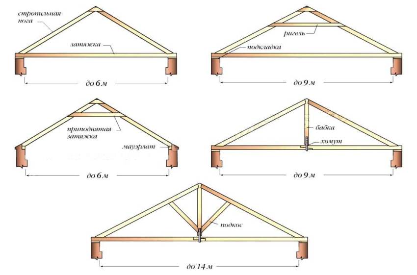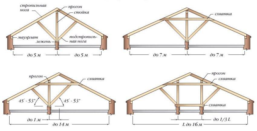 Виды двускатной крыши с наслонными и висячими стропилами