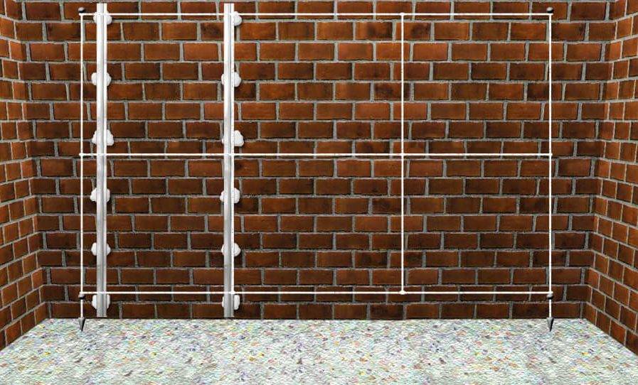 - Далее нужно немного поработать с профилями. Маячок нужно правильно разместить, а значит, на стене отметить вертикальные, горизонтальные нижние и верхние границы. С помощью правила выдержать расстояние между маяками, которое не должно превышать 165 см. Отступив от уровня пола 20 см, следует начертить горизонтальную линию. Проделать в стене отверстия в местах пересечения вертикальных и горизонтальных линий. Вставить дюбеля.