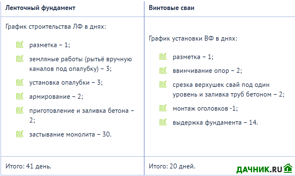 Вот примерные графики возведения ленточного и свайного оснований для жилого здания размером 36 м2: