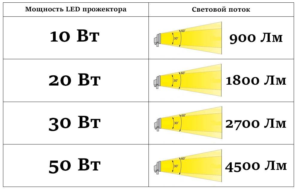 Оптимальными параметрами светодиодного прожектора для частного использования считается мощность около 50 Вт, которая обеспечивает интенсивность излучаемого света в 4000 Лм. На практике этого достаточно для качественного освещения 100 м2 территории