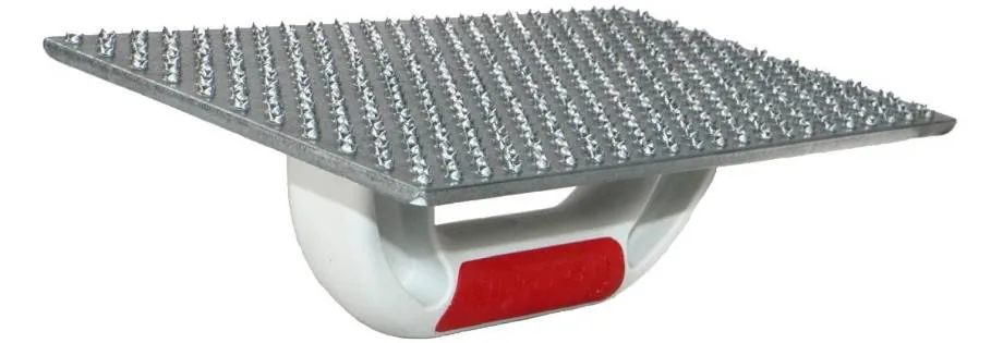 Средняя стоимость фабричной гвоздевой пластины размером 100*50 мм составляет 25 рублей. Набираем их столько, сколько нужно, чтобы заполнить длину рабочей поверхности терки, и приступаем к монтажу. Основная часть работы ничем не отличается. Лишь в конце мы берем купленные пластины и прикручиваем их на саморезы к подошве. При этом смотрите, чтобы плоскость зубьев была параллельна длинной стороне подошвы, иначе во время работы они начнут загибаться и отгибаться.