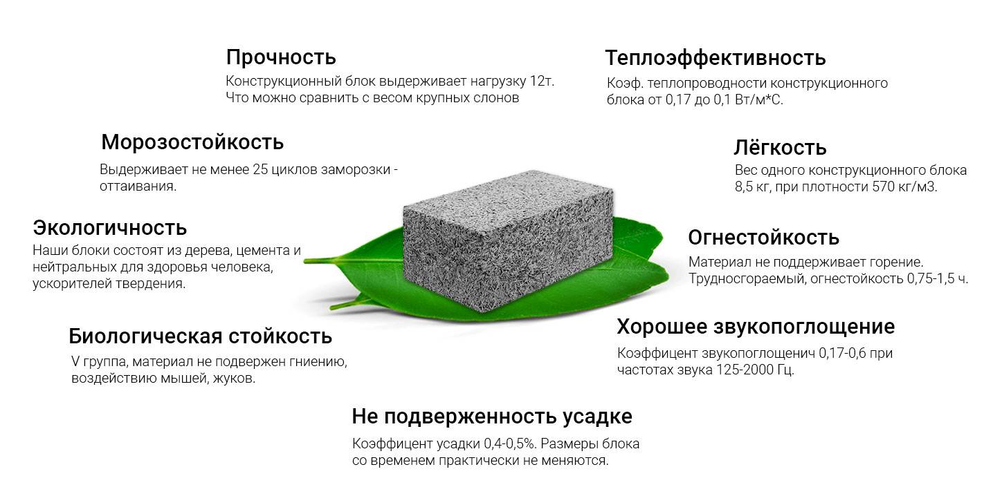 достоинства дерева и прочность бетона. Благодаря этому блок легко