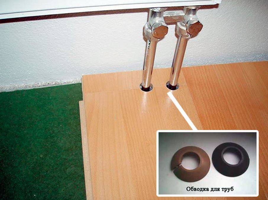 Небольшие трудности при укладке ламината встречаются возле труб и батарей. В таких случаях плитка ламината подрезается до нужного размера и дополнительно проклеивается на замках.