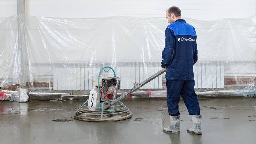 - Если составом покрывается большая бетонная поверхность, для ее нанесения используйте затирочную машинку.
