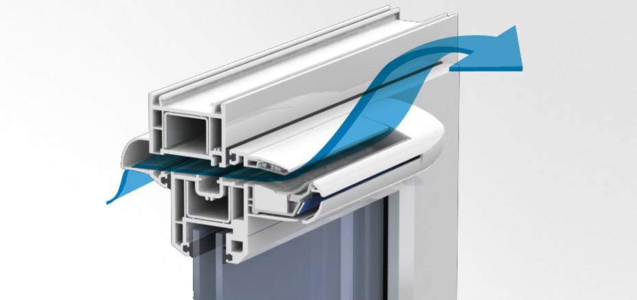 Воздушный поток в этом случае проходит длинный путь (от 1 до 2,5 м) от отверстий в прокладках притворного профиля по фальцам рамы. Еще отверстия вырезают в нижней части коробки или в месте пазов на створочном профиле. Проходя по фальцам, воздух греется, поэтому в комнату поступает чистый и не ледяной поток.