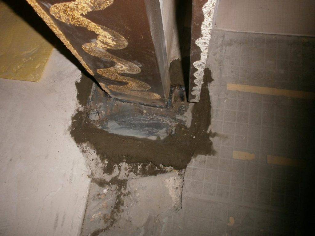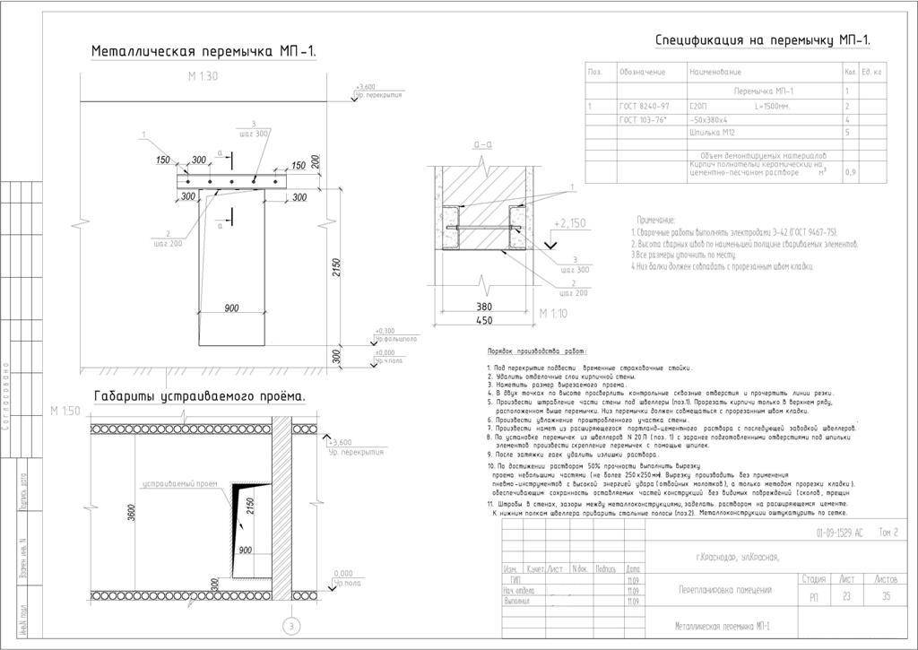 Важно, чтобы усиление кирпичных проемов производилось в виде П-образной рамы из уголка и швеллера и включало в себе перемычку (баку) и две стойки с опиранием на стальной лист, обеспечивающий равномерное распределение нагрузки