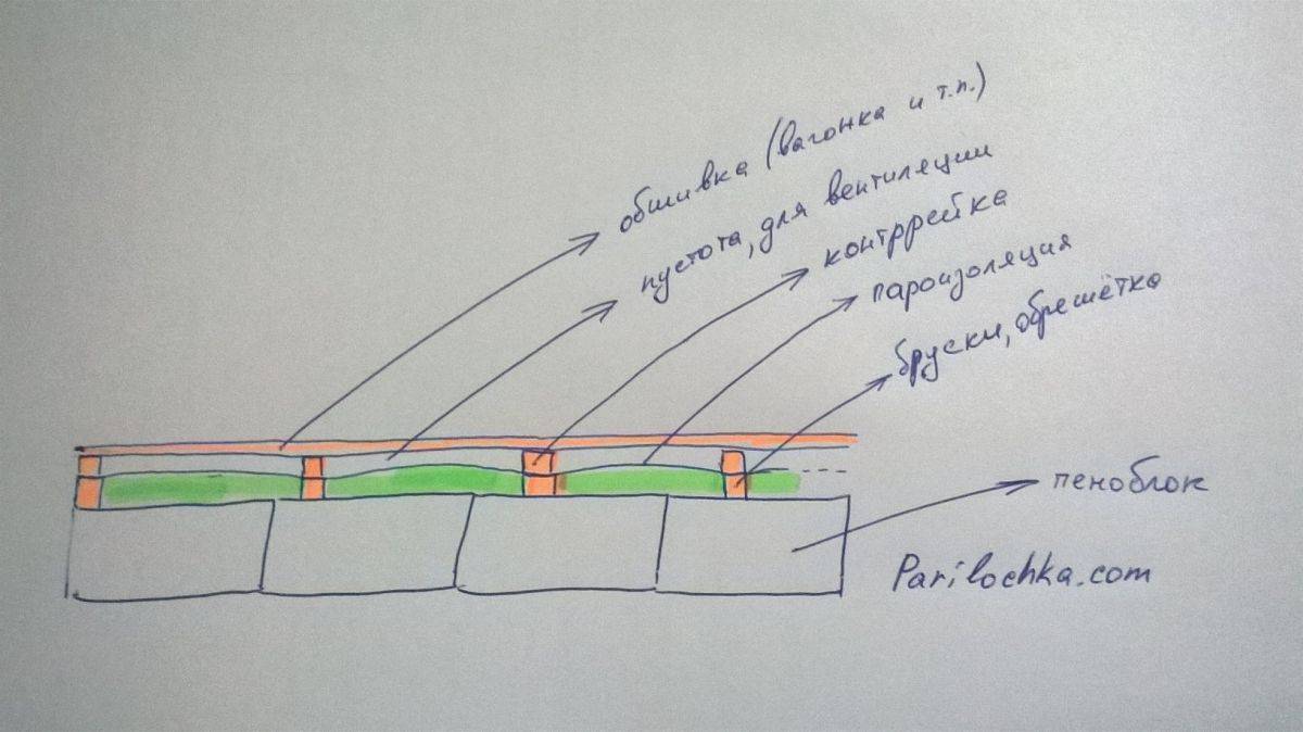 Утепление стен в бане из пеноблоков (схема подходит ко всем блочным стенам бань)