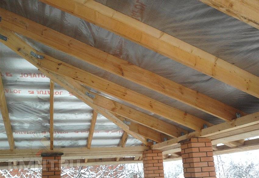 Все деревянные детали для каркаса кровли обрабатывают специальным составом, который убережет дерево от пожара. В местах, где брус будет прилегать к кирпичу или камню, его нужно обвернуть в гидроизоляцию.