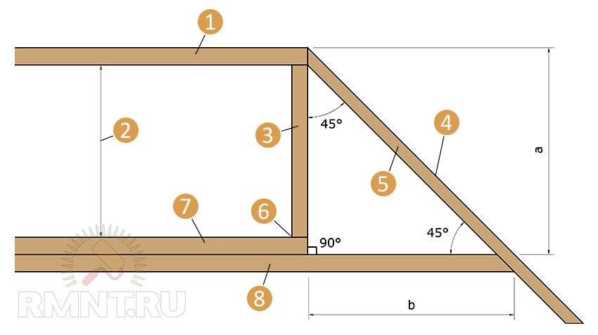 Классическая вальма с опорной стойкой a = b: 1 — коньковый прогон; 2 — высота чердака; 3 — центральная стойка (бабка); 4 — скат вальмы; 5 — ряд нарожников; 6 — точка проекции соединения ребер и конька; 7 — лежень; 8 — балка перекрытия (затяжка)