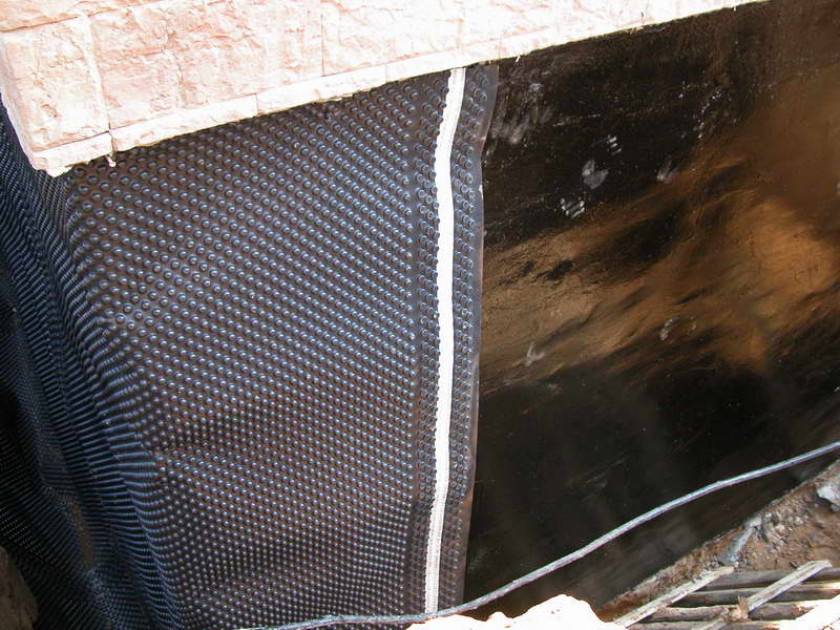 Для выполнения гидроизоляционных работ используются специальные водоупорные мембраны, которые крепятся на стены фундамента в один или несколько слоёв