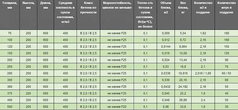 Интерес представляют также такие параметры газоблоков, как объем единицы изделия, количество блоков в 1 м³, в одном поддоне. Эти данные необходимы для определения нужного количества транспорта при доставке блоков по назначению. Ниже приведены расчётные данные для газобетонных блоков марки D400.