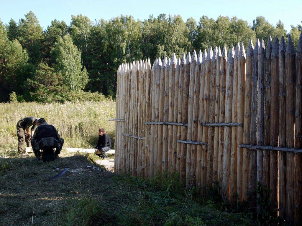 Забор из брёвен возводится сплошным массивом, высота частокола может достигать 3 метров.