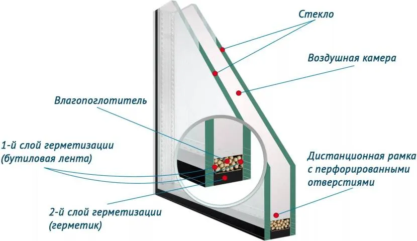 Стеклопакет представляет собой сложную герметичную конструкцию, состоящую из нескольких листов стекла, разгороженных между собой алюминиевой рамкой, под которую засыпаются шарики силикагеля — абсорбируют влагу в камере пакета. Между стеклами устанавливается двойная герметизация из бутиловой ленты, расположенной под дистанционной рамкой, и тиокола — специальной мастики, соединяющей в одно целое всю конструкцию.