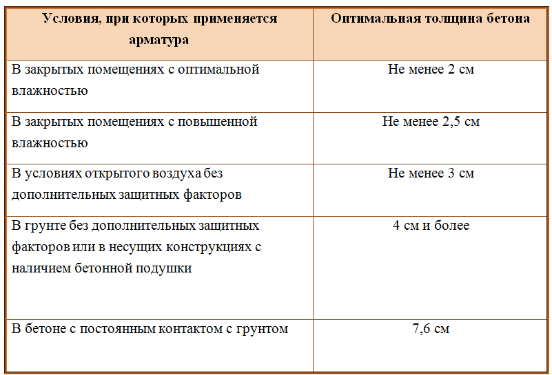 Защитный слой бетона для арматуры должен быть средней толщины, которая определяется исходя из следующих факторов: