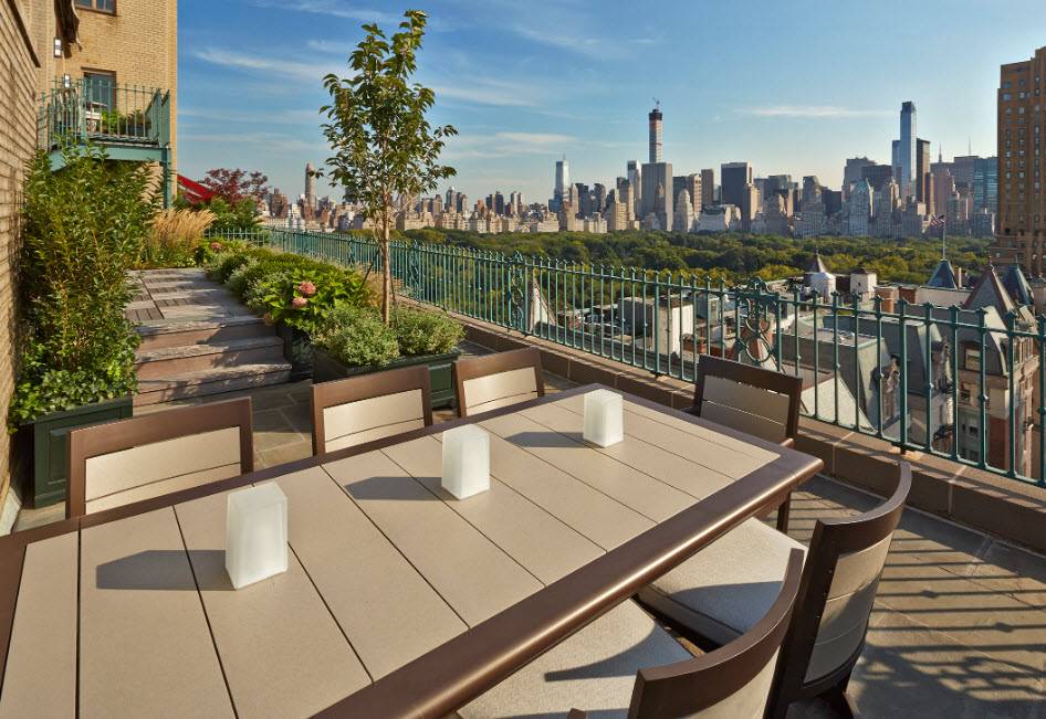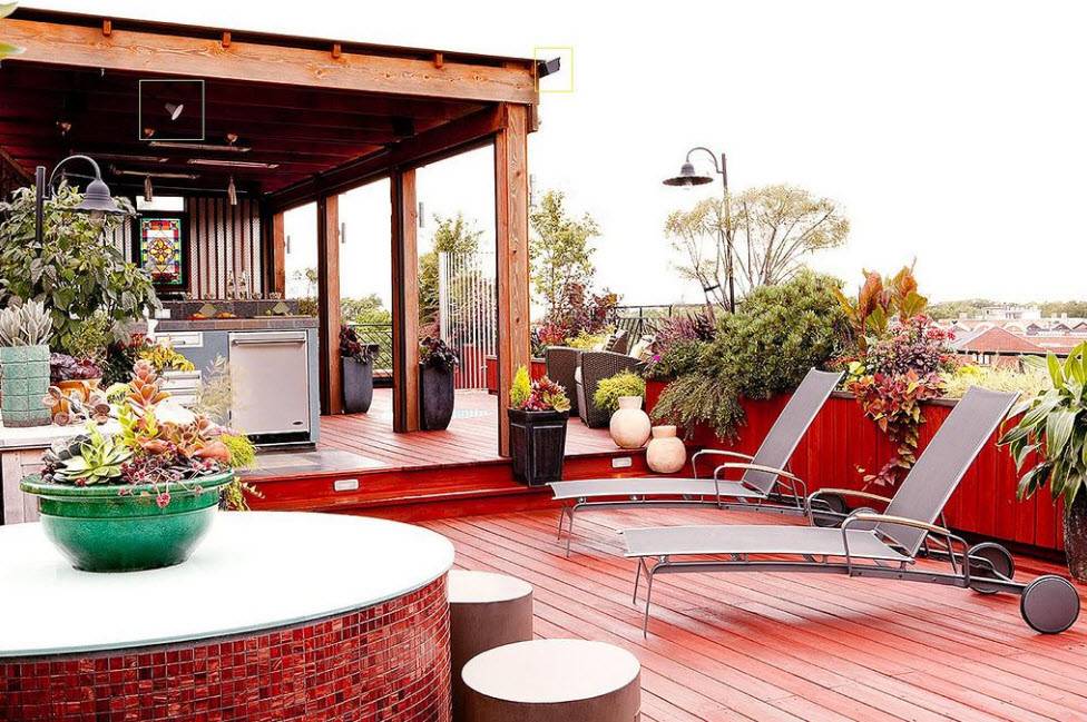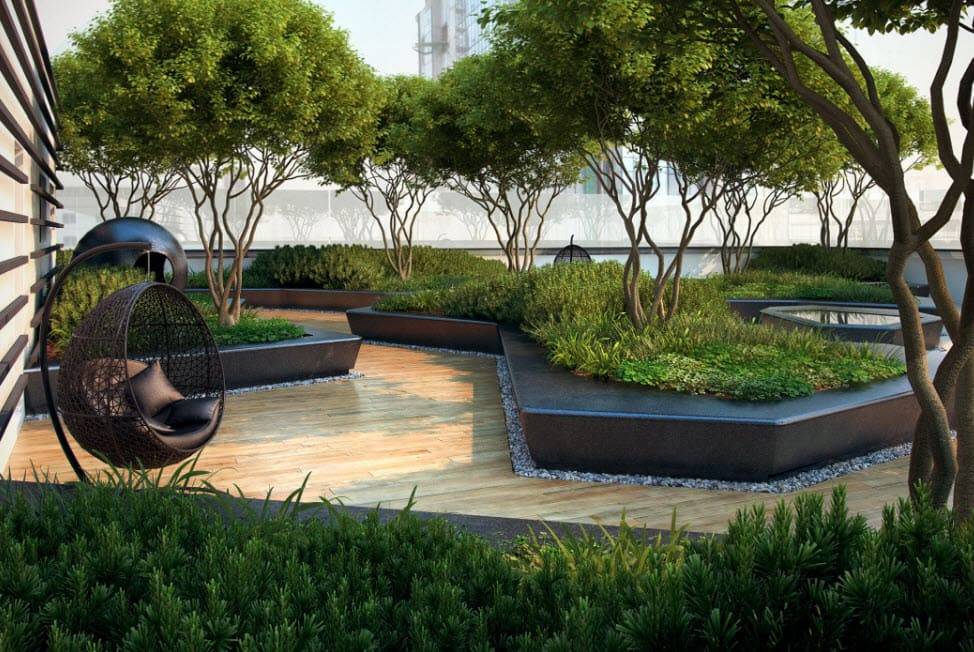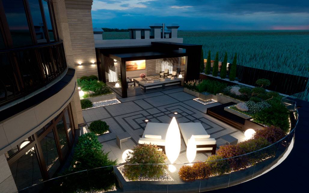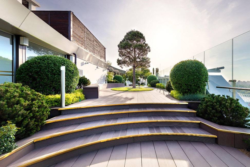 Этот вариант подразумевает разбивку на крыше полноценного сада, создание дорожек. Возможно оформление зоны, где домочадцы будут устраивать пикник, и установка беседок. Нередко на таких крышах располагаются бассейны и другие водоемы. Чаще всего их формируют на многоэтажных зданиях, торгово-развлекательных центрах. Зеленые кровли – давно не редкость для дорогих отелей.