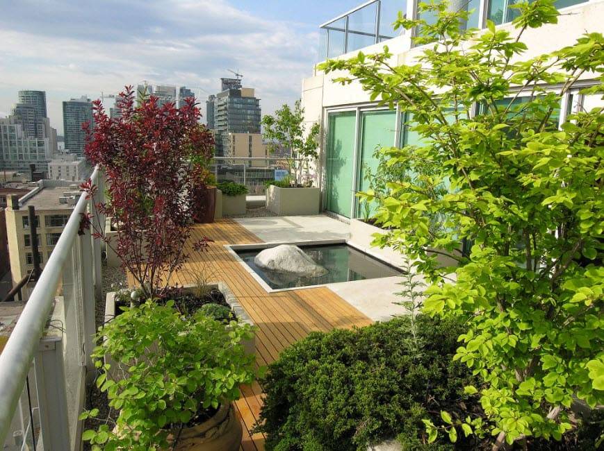 На данный момент эксперты выделяют порядка 60 видов растений, что можно использовать на крыше. К примеру, можно использовать некоторые виды очитка, растения травянистого типа. Экзотические растения здесь не приживутся, а вот лиственные кустарники и карликовые хвойные деревья – вполне. Дополнить пространство можно небольшим искусственным водоемом, что позволит создать не просто сад, а настоящую зону отдыха, где можно побыть наедине с природой.
