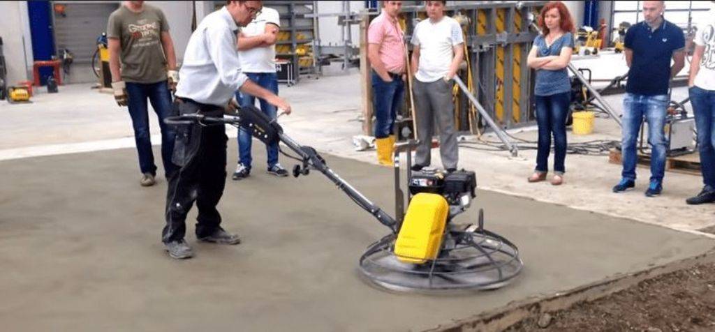 - кельмами или лопатками обрабатывают поверхность, пока она не станет темно-серого цвета. На больших площадях прибегают к помощи затирочных машин.
