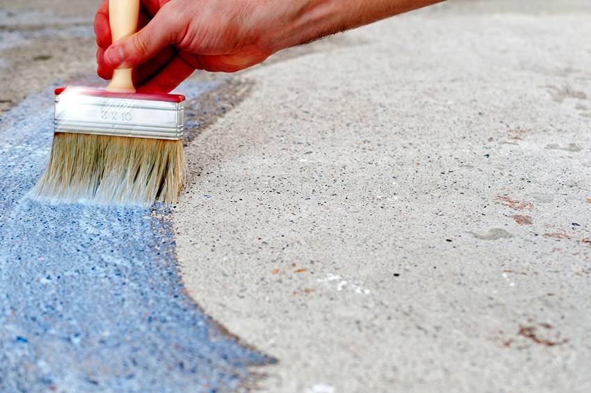 - На подготовленную поверхность наносим полимер. Поверхность бетона должна быть полностью затвердевшей, но еще немного влажной.