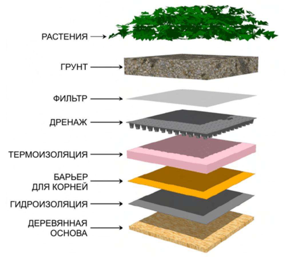 - Обязателен корнезащитный слой, который будет препятствовать прорастанию растений в гидро- и теплоизоляционные слои и глубже.